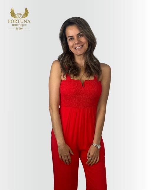 Entero rojo estilo verano, con busto elasticado y escote en V suave. De caída fluida y tela ligera que estiliza la figura. Ideal para días cálidos o para un look relajado pero femenino. Comodidad total y diseño favorecedor.